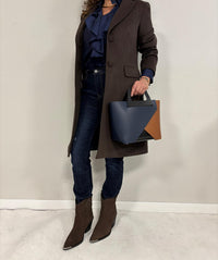 Il design geometrico e moderno è valorizzato da un raffinato gioco di colori a contrasto , che rende ogni modello unico e immediatamente riconoscibile. Le superfici in pelle liscia esaltano la qualità del materiale e donano alla borsa un aspetto contemporaneo e sofisticato.