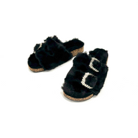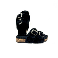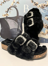Ciabatta doppia fascia con fibbie gioiello e morbido pelo nero.